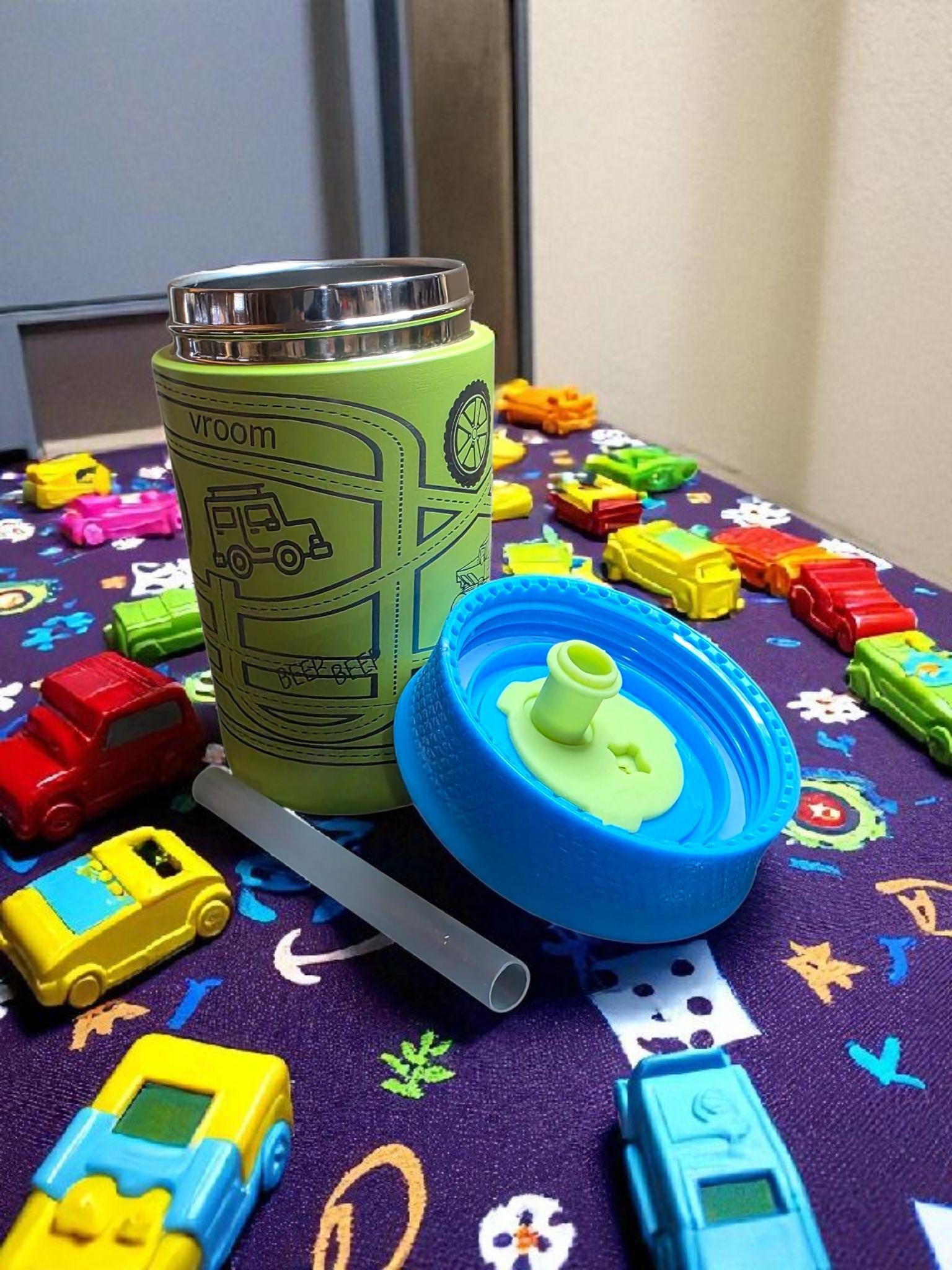 What kid doesn't need something to drink with their snacks? This tumbler is perfect for just that. This tumbler is 12oz. and comes with a straw. It fits in most cupholders. It is cream colored with an peach and purple lid. Perfect for water, juice, or whatever liquid refreshment you want to put in it. BPA-free stainless steel with a textured silicone id and straw. Dishwasher safe.